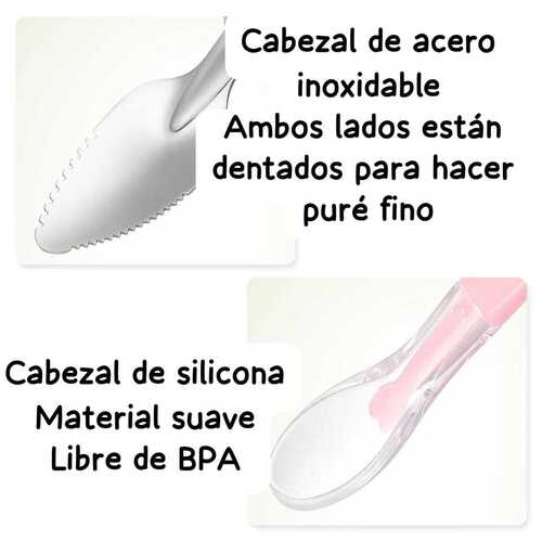 Cuchara multifuncional de doble cabezal para alimentos complementarios, se pueden raspar frutas y verduras.