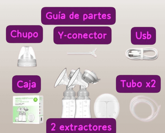 1 modulo eléctrico principal, 2 extractores de leche, 2 teteros capacidad 5 onzas c/u, 2 acoples para modo doble o sencillo, 1 rosca y tapa, 1 cable USB.